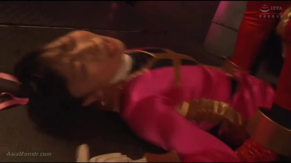 Watch an Asian performer dressed as a superheroine in a pink costume, engaging in intimate scenes in a dark room.