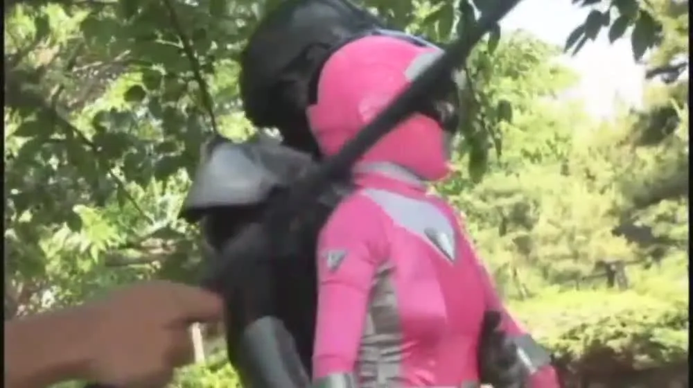 Watch an Asian woman dressed as a superheroine in a steamy outdoor lingerie photoshoot, bending over and revealing her underwear.
