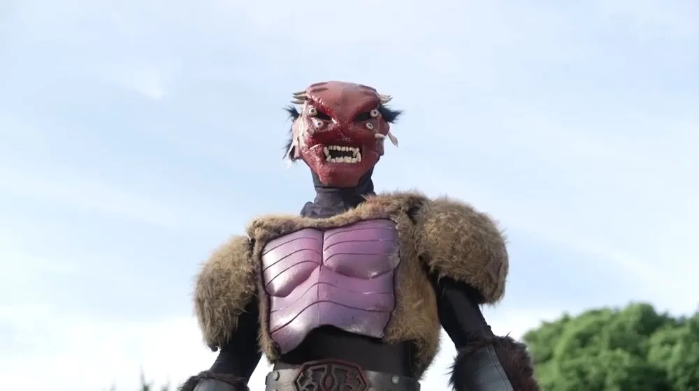 Watch Asian women in superhero costumes fight a muscular man in a monster costume in a thrilling outdoor battle.