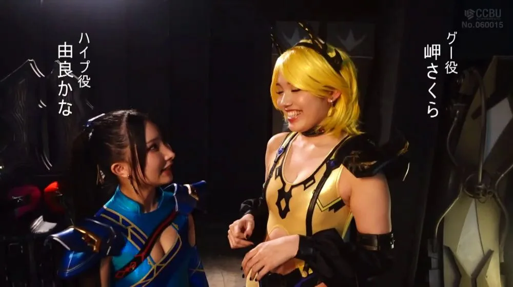 Watch two Asian women dressed as superheroes posing and interacting in various settings, from outdoor streets to dark industrial areas