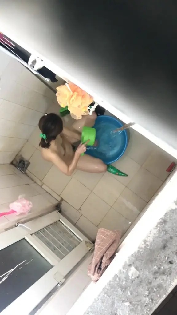 Watch an Asian teen with black hair in a bun, bathing alone in a bright bathroom with various props.