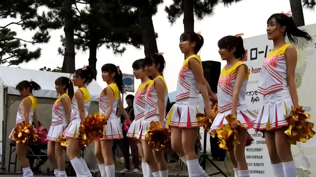Watch a group of Asian teen cheerleaders perform outdoors with pom-poms and uniforms in a lively park or event space setting