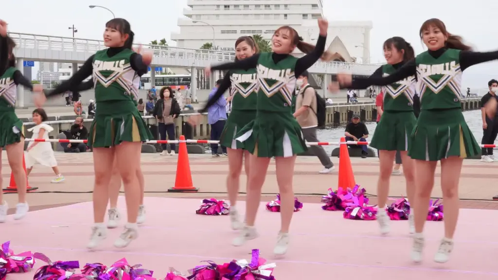 Watch a group of Asian teen cheerleaders performing outdoors with pink pompoms and cheerleader uniforms