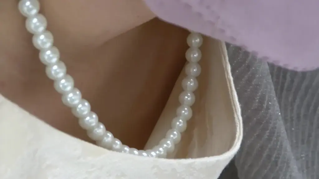 Watch an Asian woman in her 20s dry off with a towel in a bathroom, pearl necklace close-up