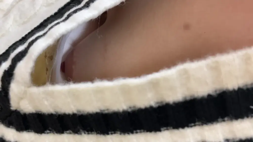 Get up close and personal with a stunning Asian teen as she showcases her cleavage in a black and white striped sweater
