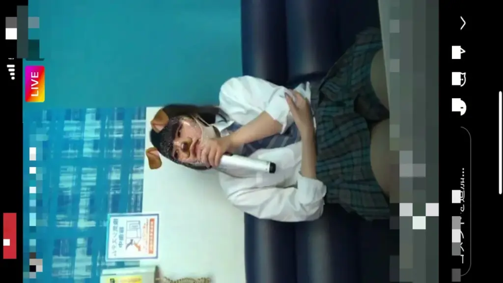 Watch a slim Asian girl in her 20s with long black hair, wearing a dog ears headband, white shirt, and plaid skirt, playing with a tablet and microphone on a couch