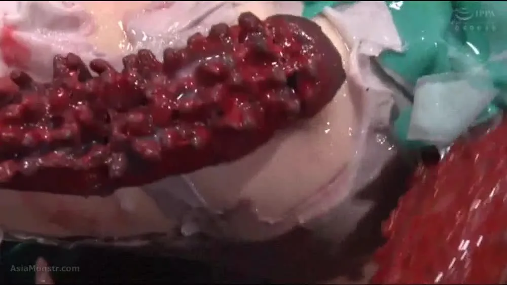 Watch an Asian woman in her 20s with black hair in a green dress being restrained and manipulated with red tentacle-like objects