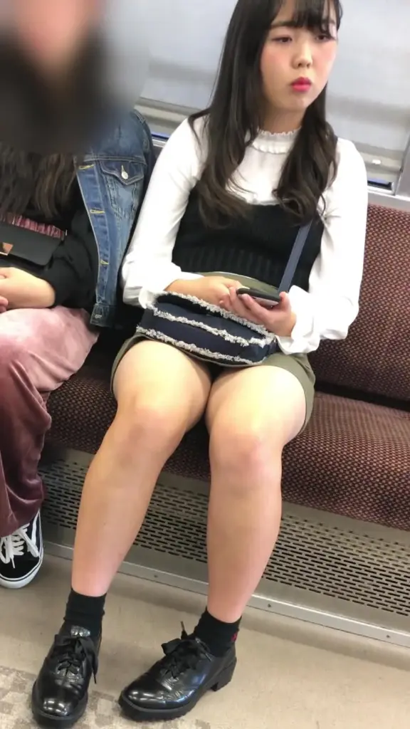 Watch an Asian teen girl in green shorts on public transportation, showcasing her slim figure and long black hair.