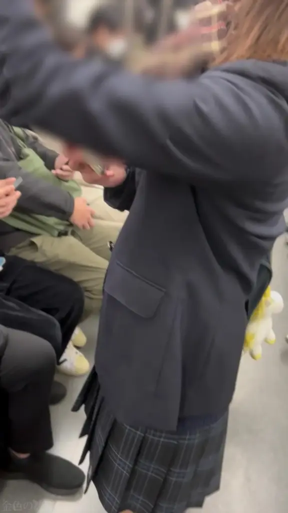 Watch an Asian girl in a plaid skirt get exposed and intimate in public transportation settings, featuring close-ups and medium shots.