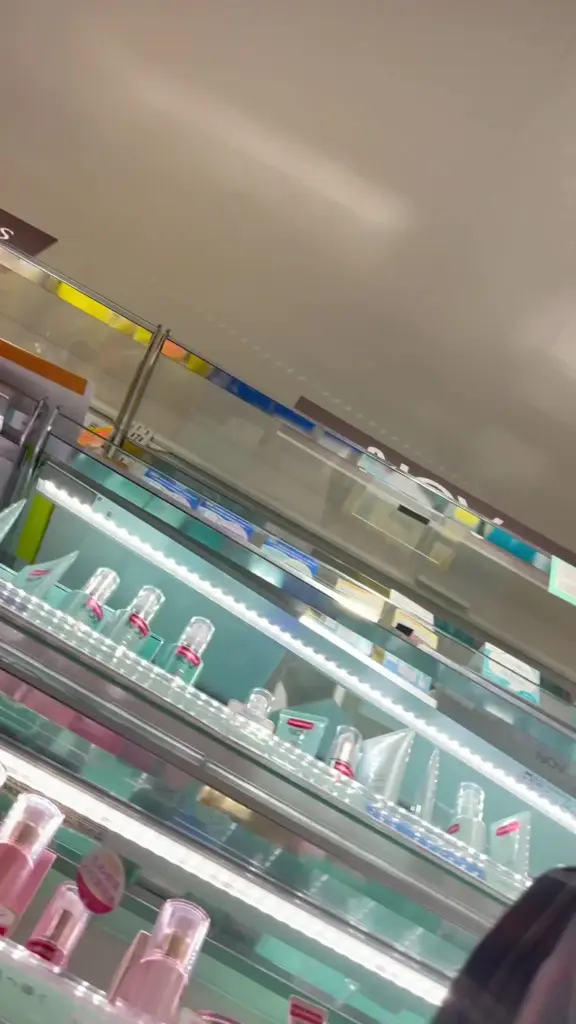 Watch a young Asian woman in a plaid skirt expose herself in a store setting, surrounded by cosmetics and skincare products.