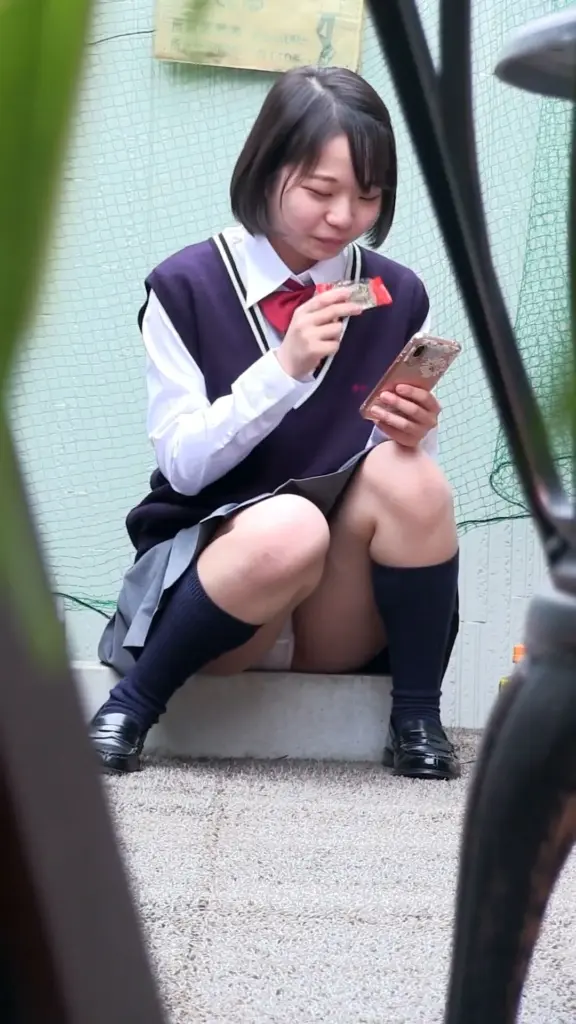Watch an Asian teen girl in a school uniform sitting outside, engrossed in her phone, showcasing her slim figure and black hair in natural light.