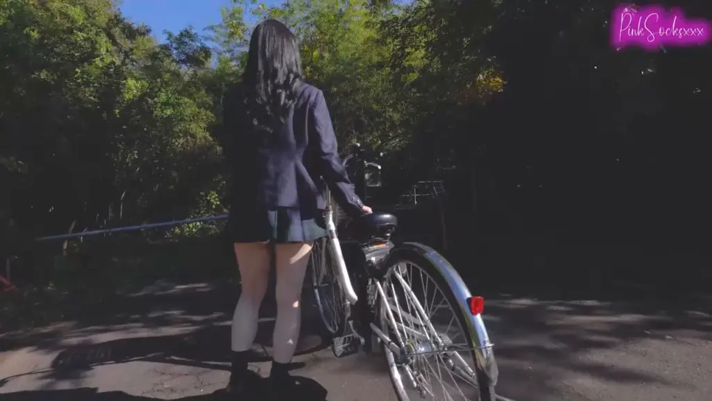 Watch a young Asian teen in a school uniform riding a bicycle in a park. Enjoy this outdoor scene with natural daylight.