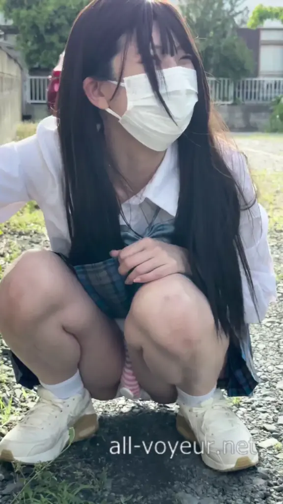 Watch Asian teen in white shirt and blue plaid skirt in outdoor setting