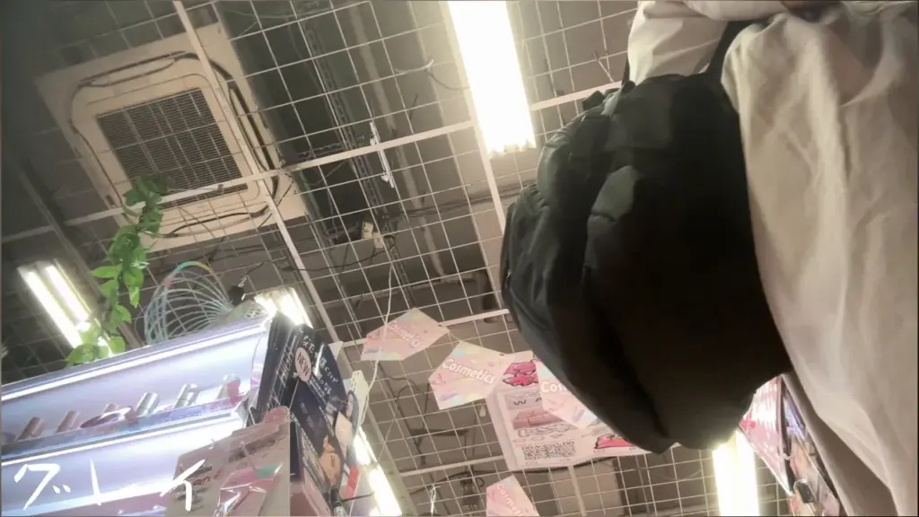 Watch a slim Asian teen with long brown hair dressed in a white blouse and jean skirt in a clothing store. POV shots and low angles capture every detail.