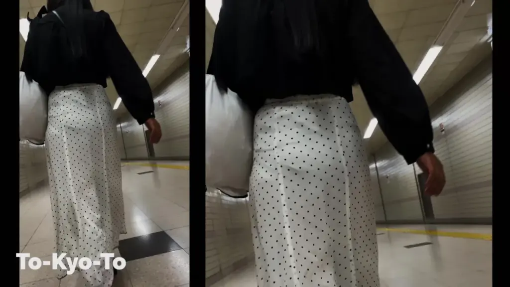 Watch an Asian girl in her 20s wearing a white skirt with black dots in various subway scenes
