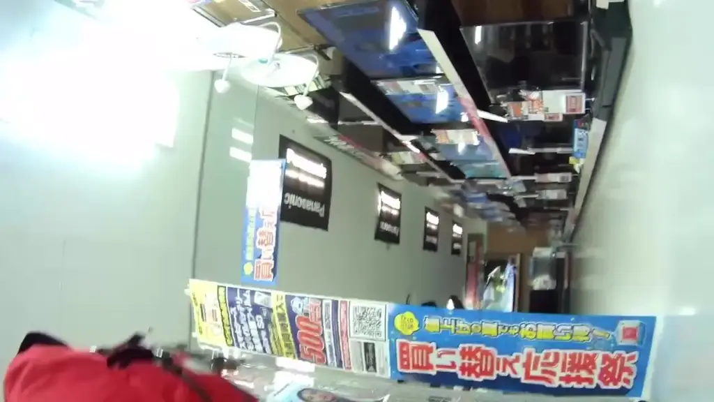 Watch a slim Asian girl lift her skirt in a store setting, captured in POV with fluorescent lighting