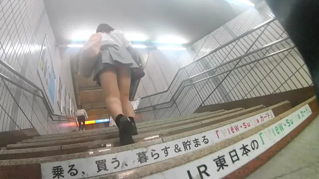 Watch a slim Asian teen with short black hair in a steamy POV scene on a train and stairs at a train station