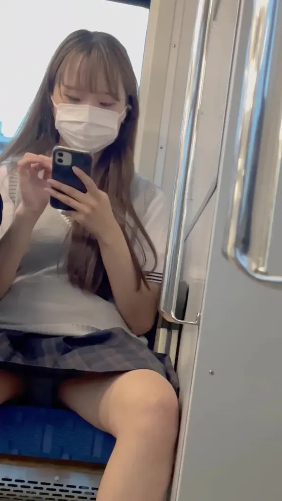 Watch a young Asian schoolgirl riding a train, wearing a uniform and face mask, in a series of intimate moments.