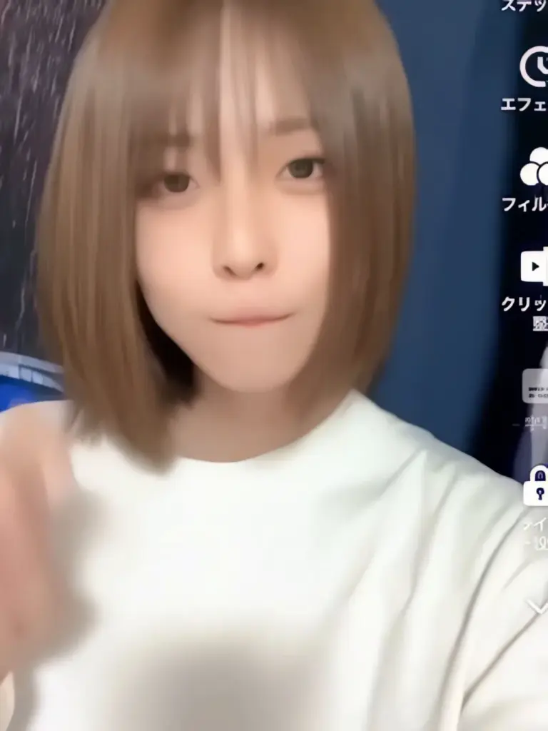 Watch an Asian woman in her 20s with a slim body and short dark hair pose topless and dressed in a bedroom with blue curtains