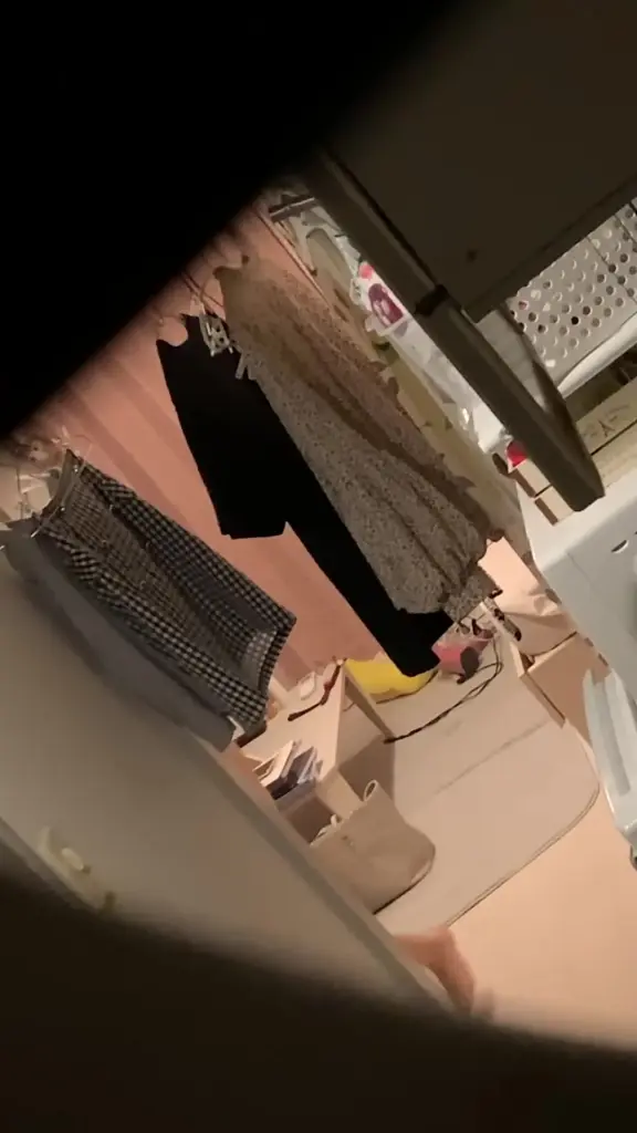 Watch an Asian woman in her 20s sitting in a cozy bedroom surrounded by clothes and shoes