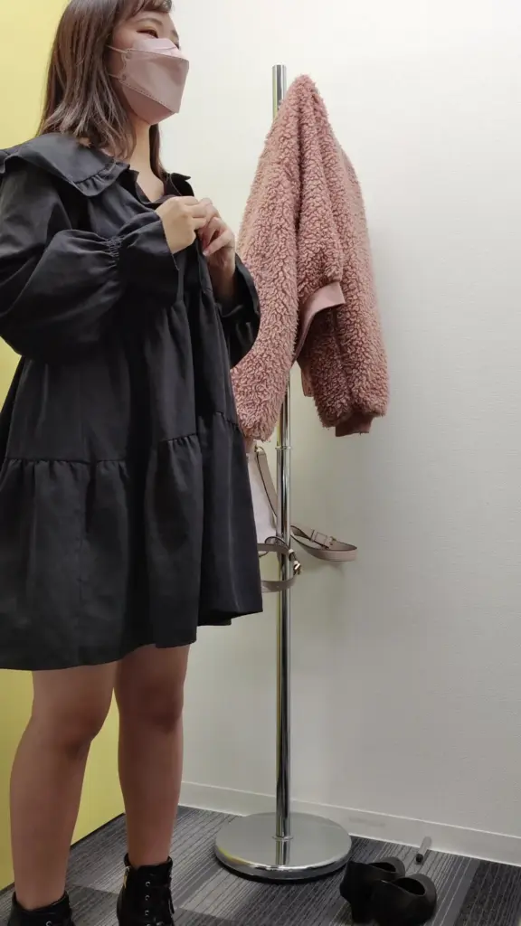Watch a slim Asian teen try on various outfits in a bright fitting room, from underwear to a black dress and pink jacket.