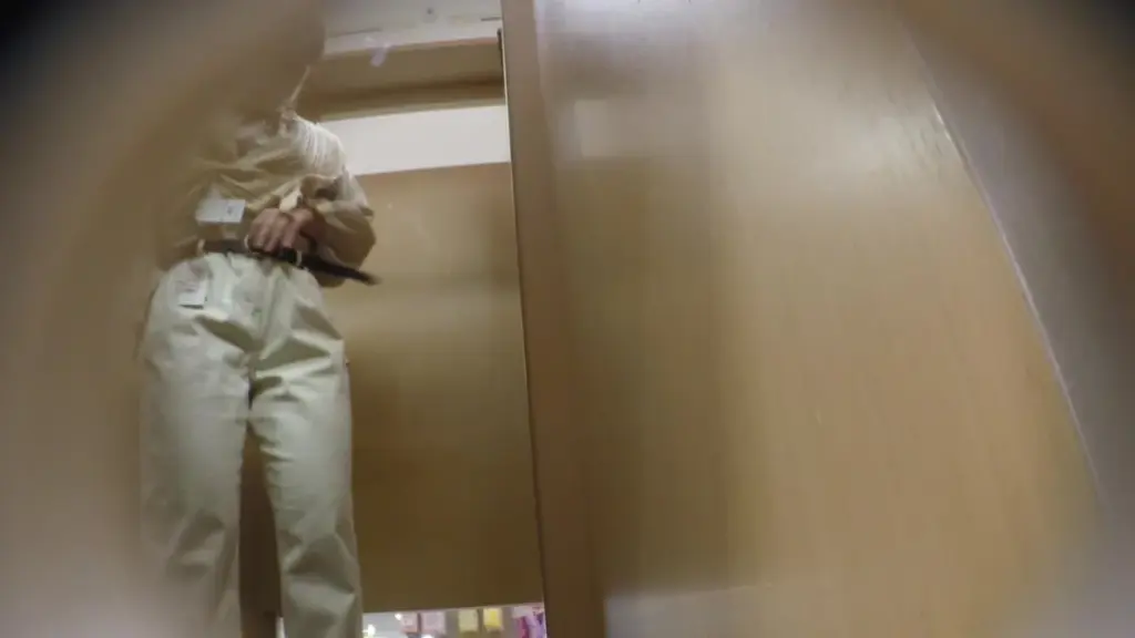 Watch a slim Asian woman undress in a changing room, captured in POV with a low-angle camera under fluorescent lighting.
