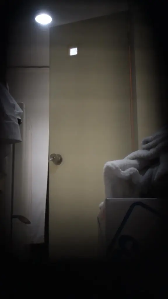 Watch an Asian teen undress and pose nude in a dimly lit bedroom and bathroom, captured in medium and close-up shots.