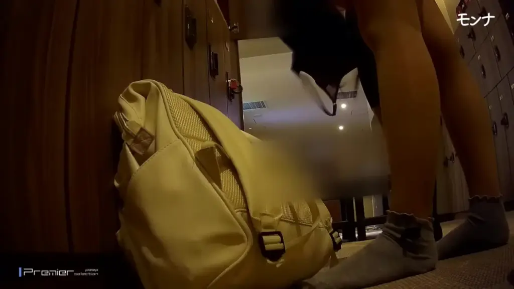 Watch as a slim Asian teen changes clothes in a dimly lit locker room, bending over and showing off her black ponytail hair.