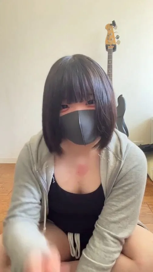 Watch an Asian woman with a slim body and dark brown bob hair posing in various settings, wearing a black face mask