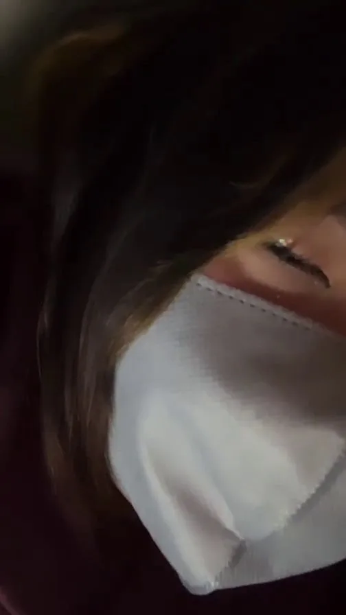 Intimate POV encounter with an Asian teen wearing a white face mask in a dimly lit bedroom