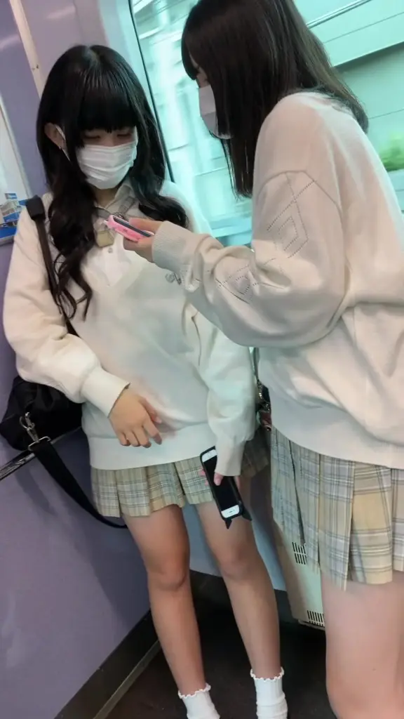 Watch two Asian teens in matching white sweaters and plaid skirts on a crowded subway car, engaging in intimate moments.
