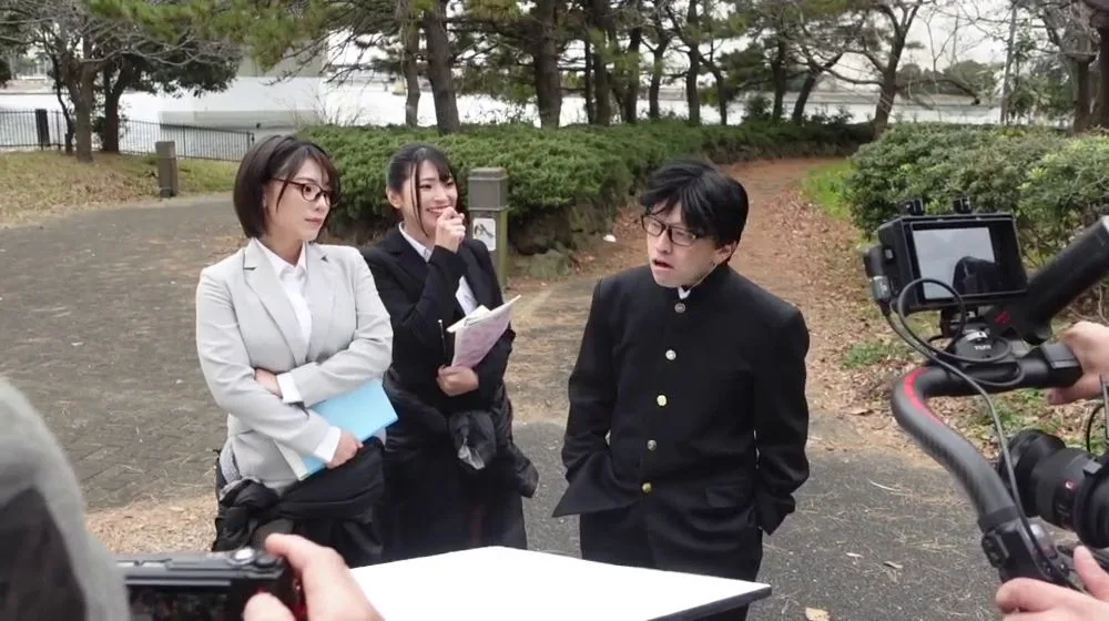 Witness the natural beauty of an outdoor setting with Asian performers in an intimate encounter, captured in daylight with a mix of close and wide shots.
