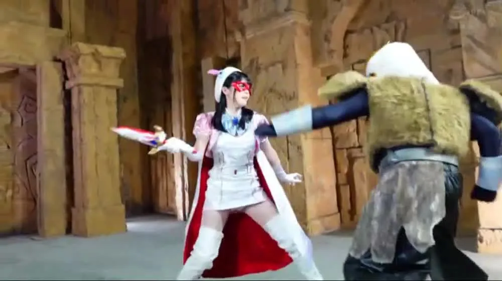 Watch an Asian woman and a man dressed in ancient costumes engage in an intense sword fight in a ruined temple