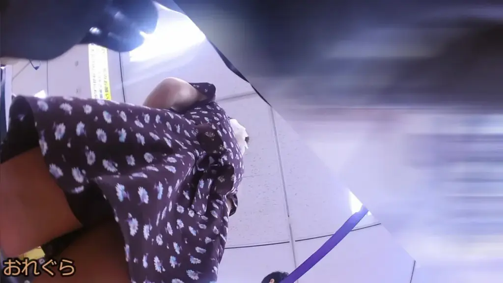 Watch an Asian woman in her 20s wearing a black dress with white flowers expose her thighs in a public area.