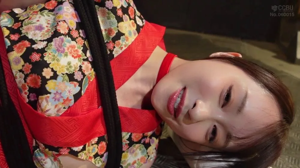 Watch an Asian woman in her 20s with short brown hair enjoy intimate moments, wearing a floral kimono with red sash and fishnet stockings.