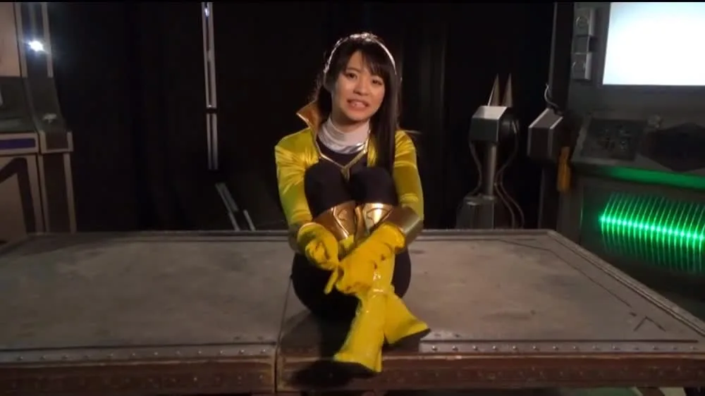 Watch an Asian woman with straight black hair and bangs in a dramatic futuristic setting, posing and lying on the ground.