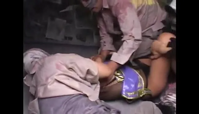 Watch an Asian woman in a purple outfit and fishnet stockings being restrained and assaulted by multiple masked men in a dimly lit room.