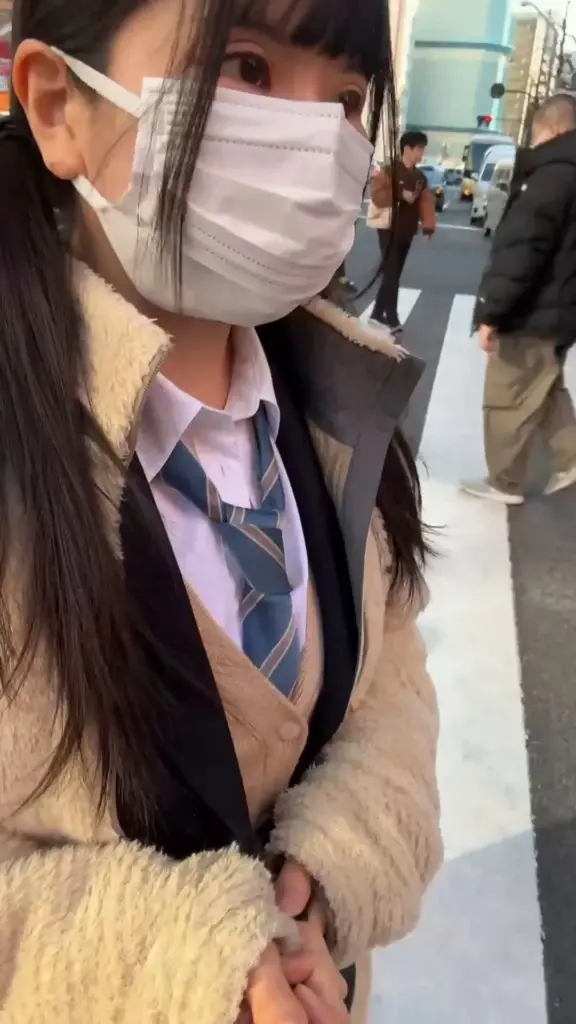 Watch an Asian woman in black stockings and underwear posing on a train, then walking on the street with a cane.