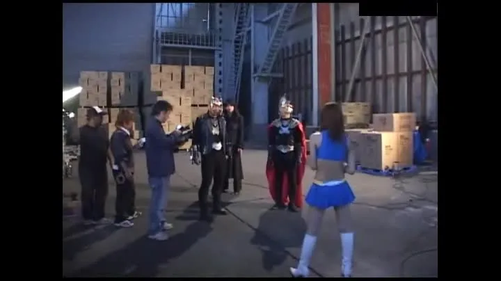 Watch an Asian woman in white boots engage with men in costume in a warehouse setting, featuring various camera angles and shots.