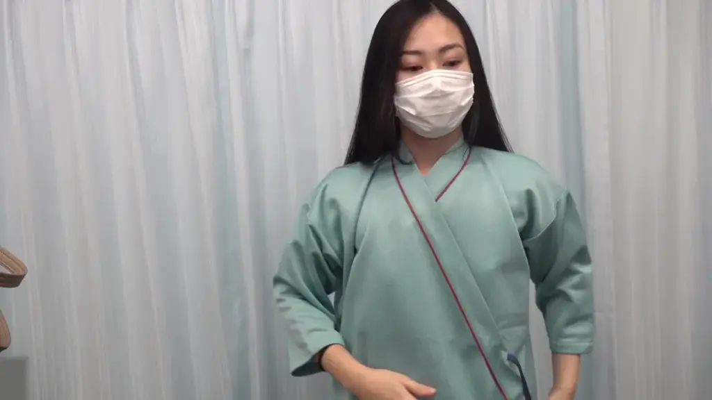 Watch an Asian woman in her 20s with a white face mask reveal her topless figure in a medical setting with bright lighting