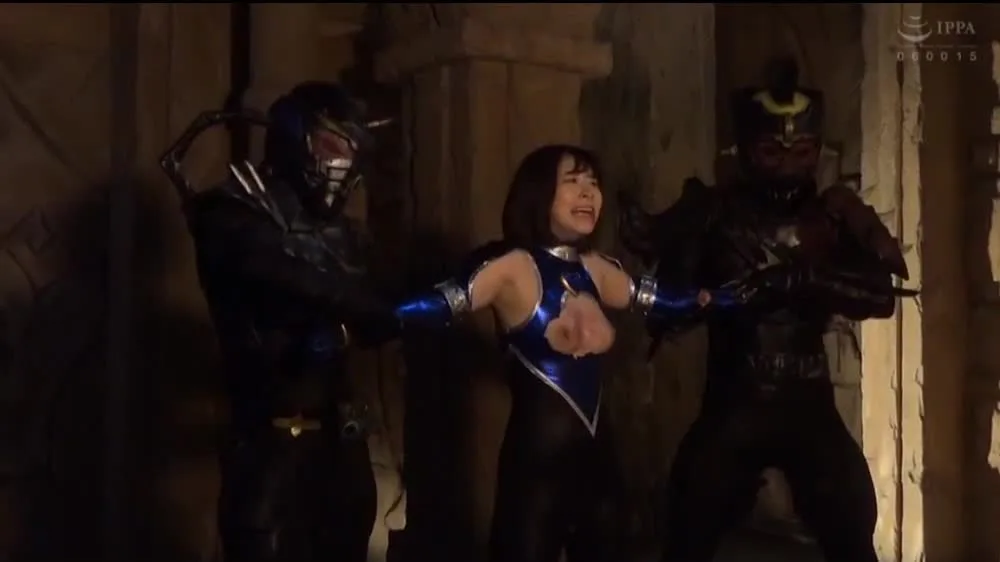 Watch an Asian woman wearing a blue and silver costume being restrained by two men in a dimly lit dark room with stone walls