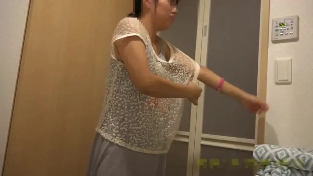 Watch an Asian woman in her 30s undress in a bedroom, captured on camera with a low angle and medium shot.