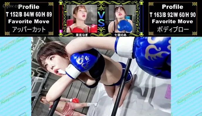Watch four Asian women engage in a fierce boxing match, wearing sports bras and boxing gloves in a gym or boxing ring.