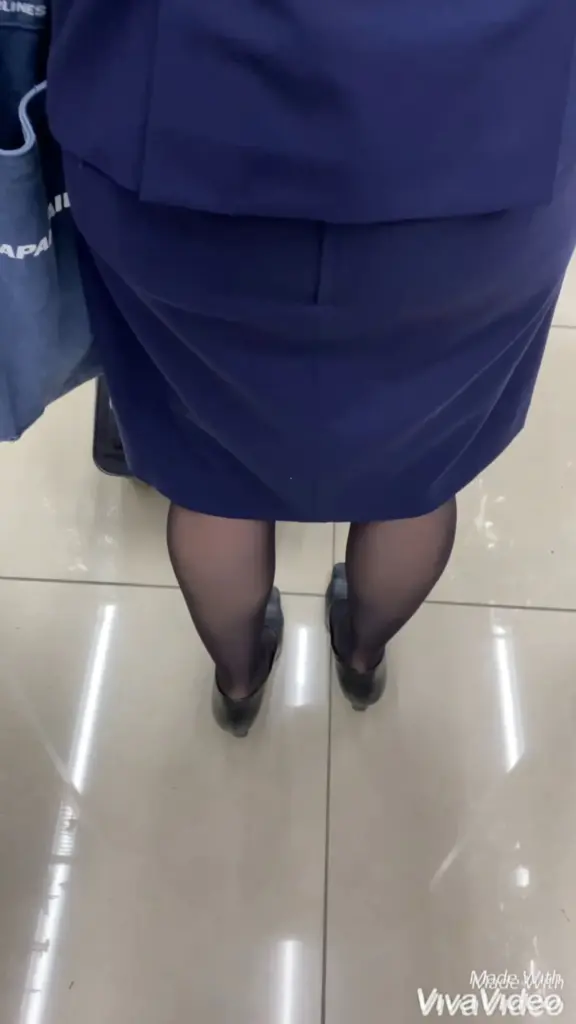 Watch two Asian women dressed in blue uniforms, heels, and tights in a store setting.