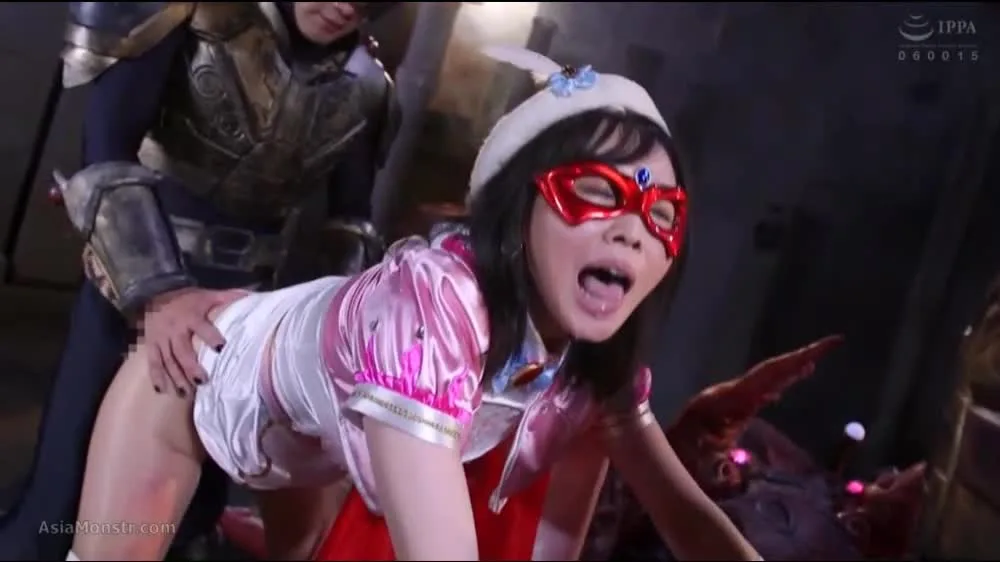Watch Asian women in their 20s, wearing red masks and white outfits, being restrained by a muscular man in costume armor, in a studio setting with artificial lighting