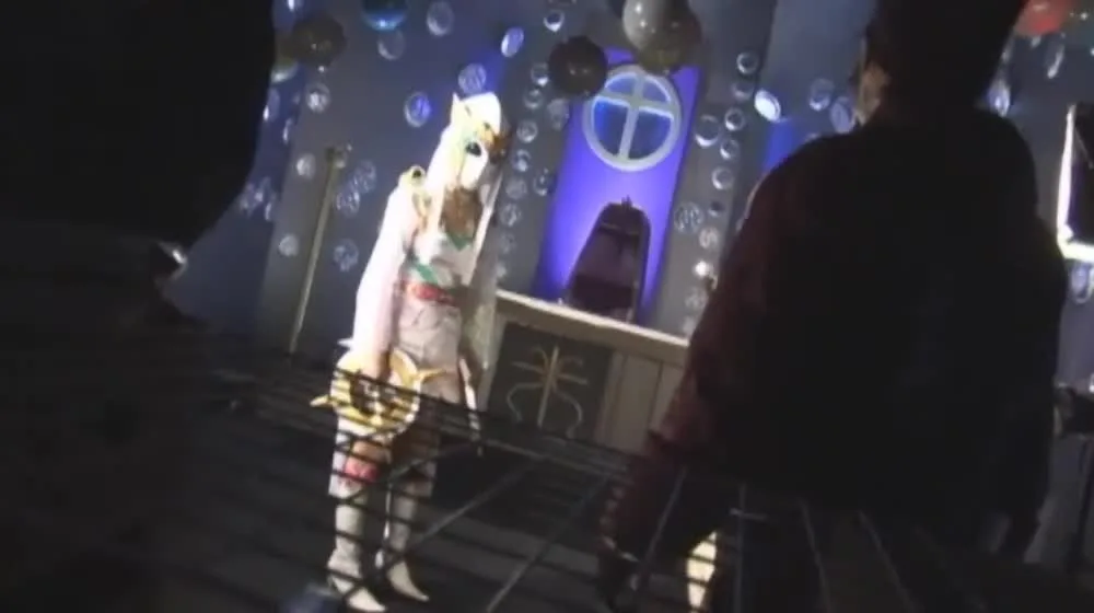 Watch two Asian women in elaborate costumes performing on stage with smoke and bubbles, captured in close-up and medium shots