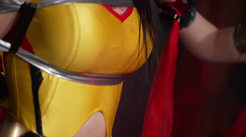 Watch Asian women in elaborate costumes interact intimately in a dimly lit industrial setting, featuring yellow and red attire.