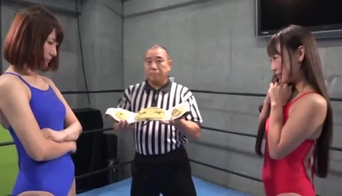 Watch Asian women engage in intense wrestling matches, dressed in pink and blue unitards, in a ring with blue mats and black railings.