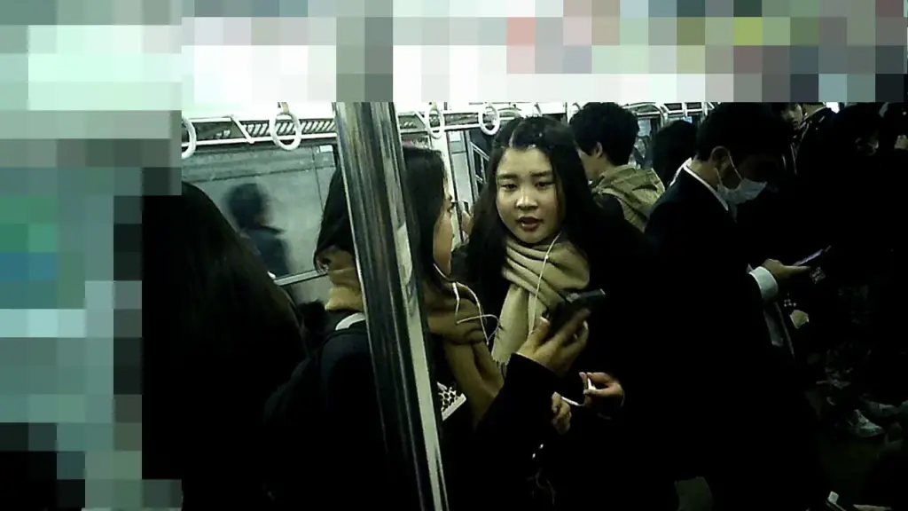Watch Asian women standing close together on a crowded train, some wearing masks and holding phones.