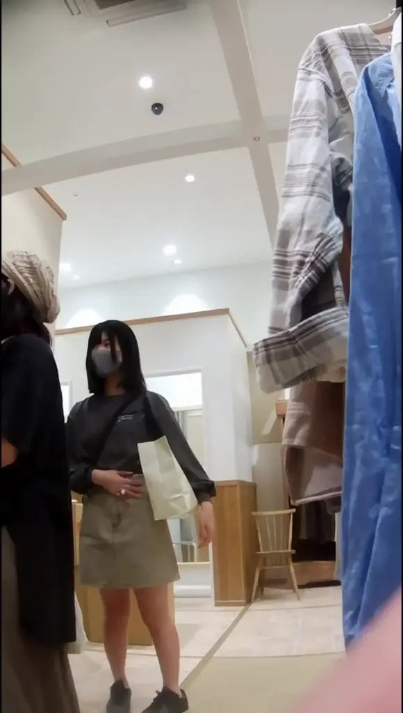 Watch slim Asian women browsing and trying on clothes in a clothing store, captured in POV and close-up shots